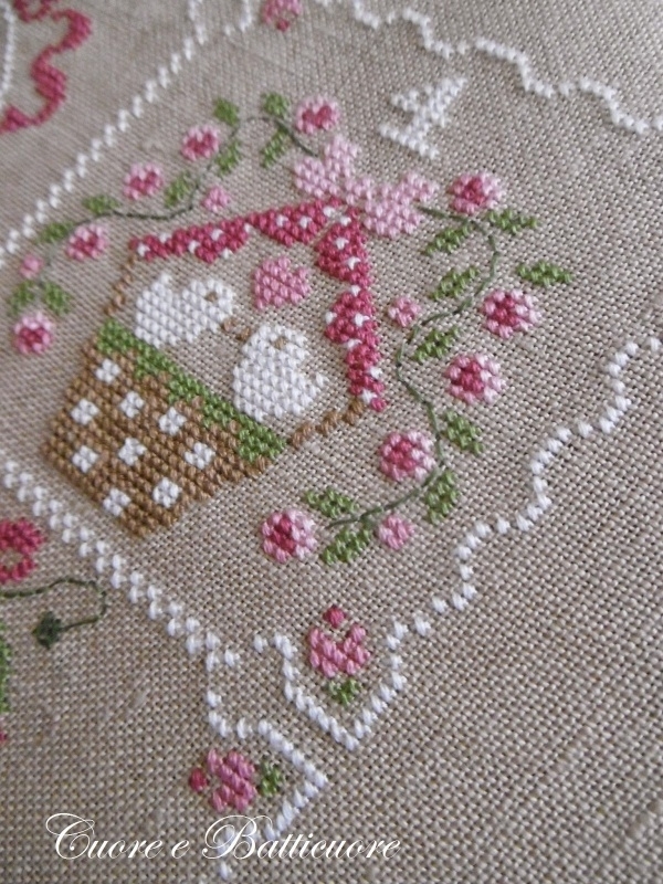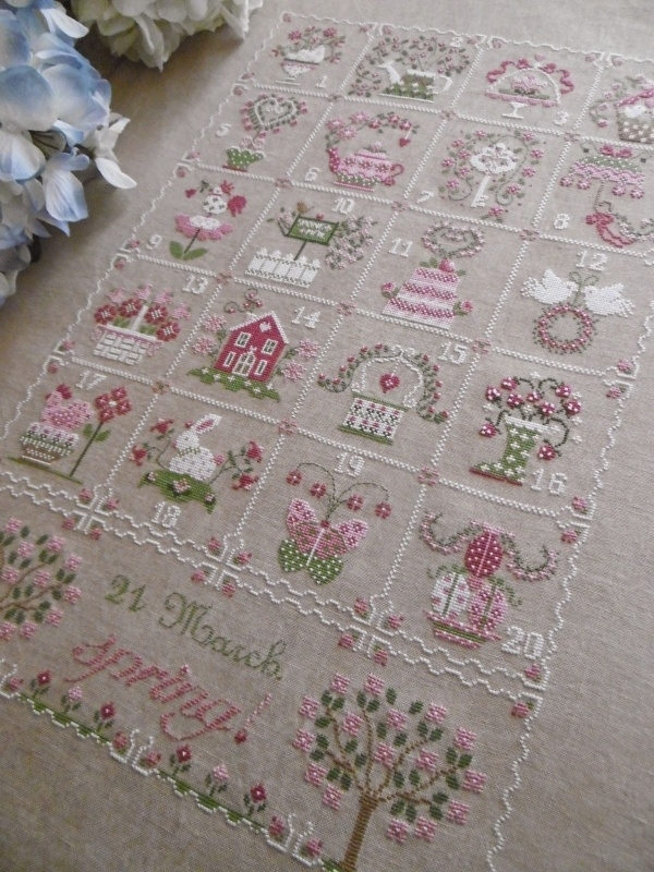 OverzichtSuper mooi lente patroontje, met keuze tussen italiaanste tekst "21 Marzo - Primavera", engelse tekst "21 March - Spring !" of franse tekst "21 Mars - Printemps !" Volledig met DMC-draad geborduurd. Benodigde kleuren : Blanc, 3716, 962, 3350, 470, 3346, 3345, 167, 743