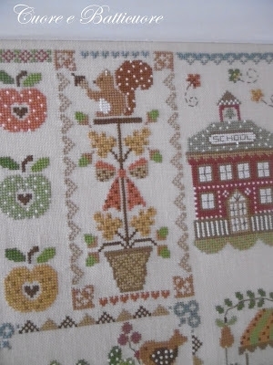 Enkel het patroontje. Volledig geborduurd met DMC-draad. Benodigde kleuren blanc-950-152-3354- 3722-3721-3803-801-3862-3828-469-470-471-927-926.